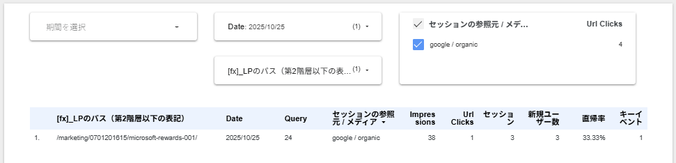 Looker Studioでサーチコンソールと日付補正したGA4のデータを統合してランディングページ×日付のテーブルを作る 2025.11.11